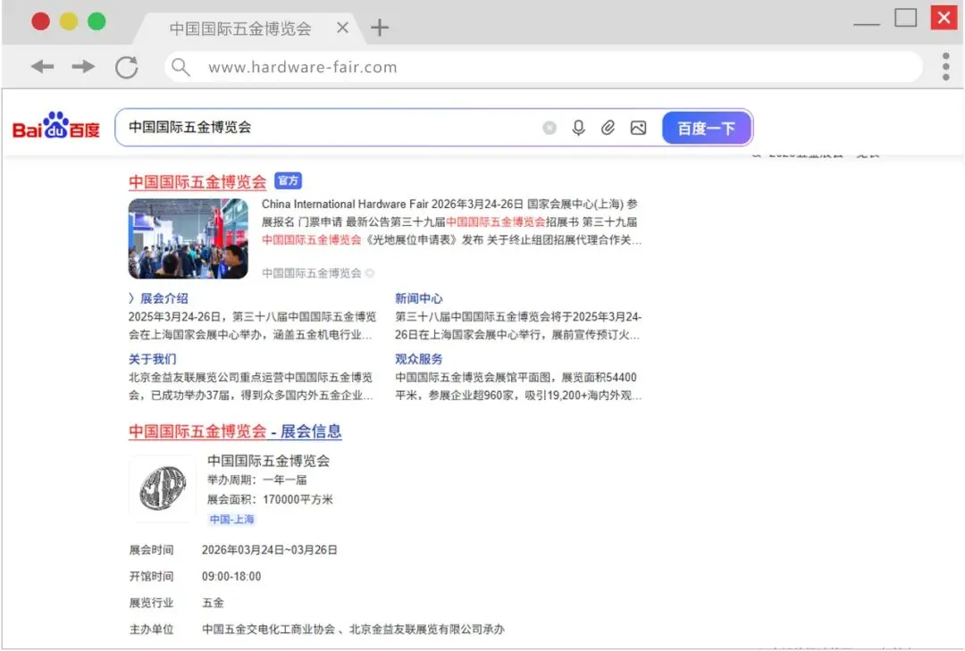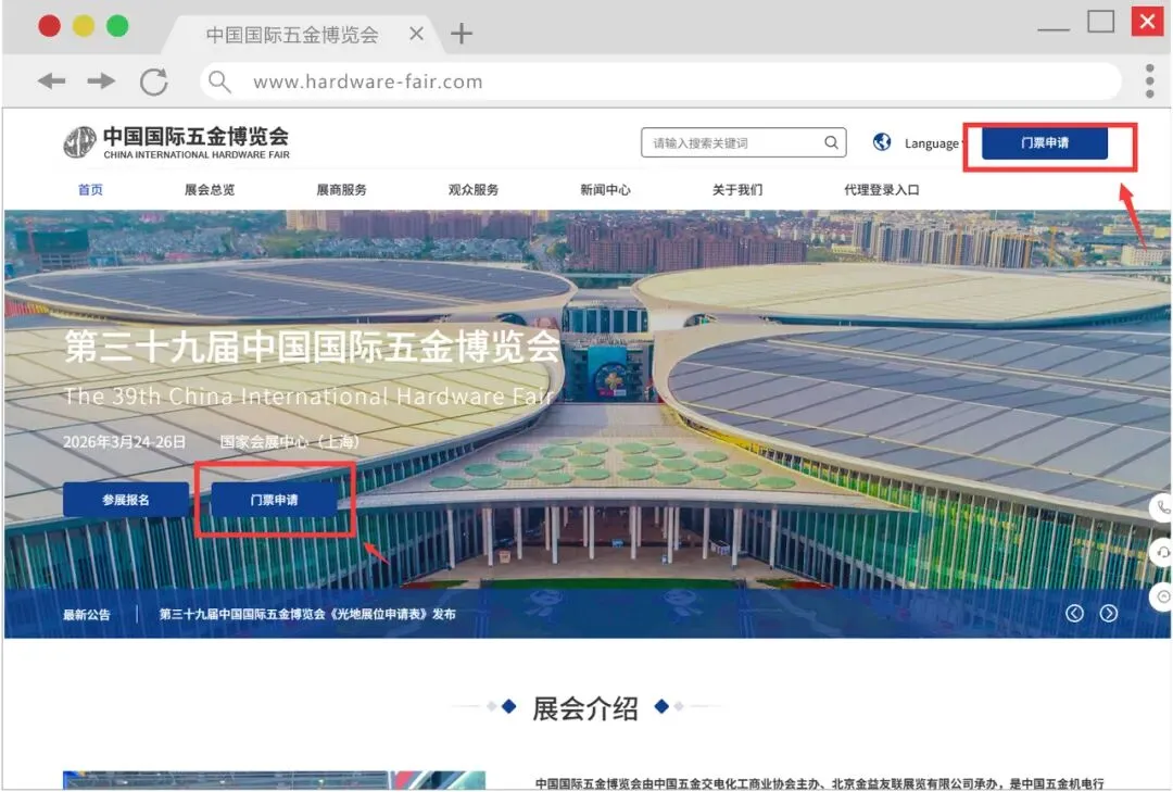 观众可访问展会官方网站 www.hardware-fair.com,或通过百度搜索引擎检索“中国国际五金博览会”,点击带有蓝色“官方”认证标识的链接进入官网首页,随后通过导航栏或页面下方的“门票申请”按钮(如图所示)进入申请页面,填写相关信息并提交申请,入场时请携带本人身份证原件。