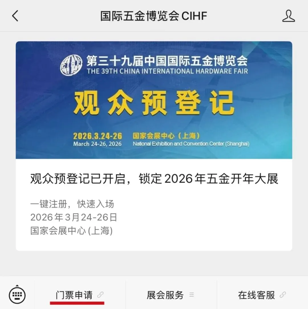 观众可通过关注博览会官方微信公众号“国际五金博览会CIHF”,选择底部“门票申请”进入预登记页面,根据页面提示填写相关信息并提交申请。参观当日请携带本人身份证原件至现场,刷证入馆参观。